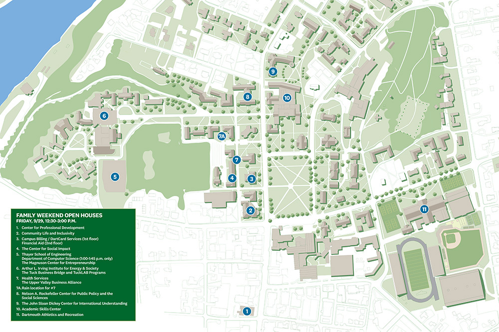 Open Houses Academic Skills Center Arthur L. Irving Institute for Energy & Society Dartmouth Athletics and Recreation Campus Billing and DartCard Services Center for Professional Development The Center for Social Impact Community Life and Inclusivity Department of Computer Science (1:00–1:45pm only) Financial Aid Health Services The John Sloan Dickey Center for International Understanding The Magnuson Center for Entrepreneurship Nelson A. Rockefeller Center for Public Policy and the Social Sciences The Thayer School of Engineering invites you to explore the West End of campus! |